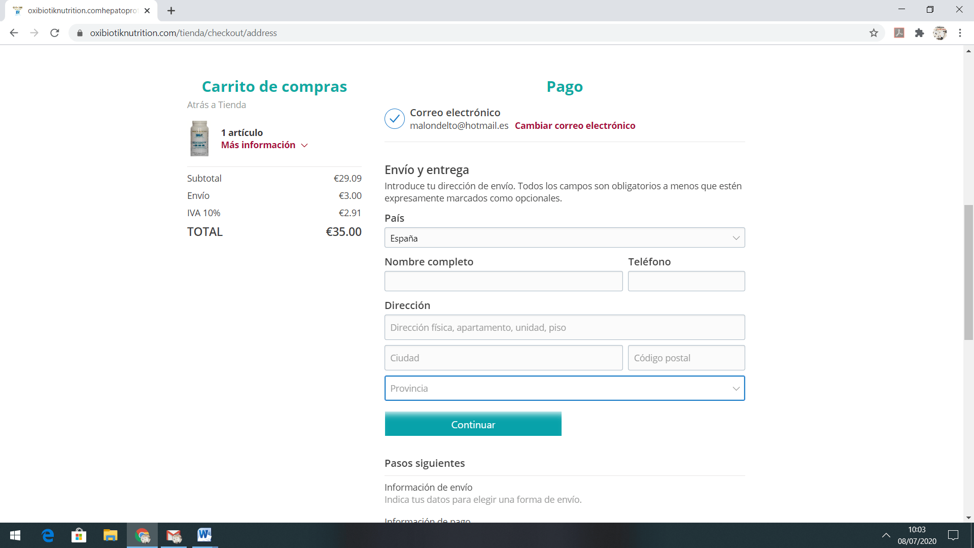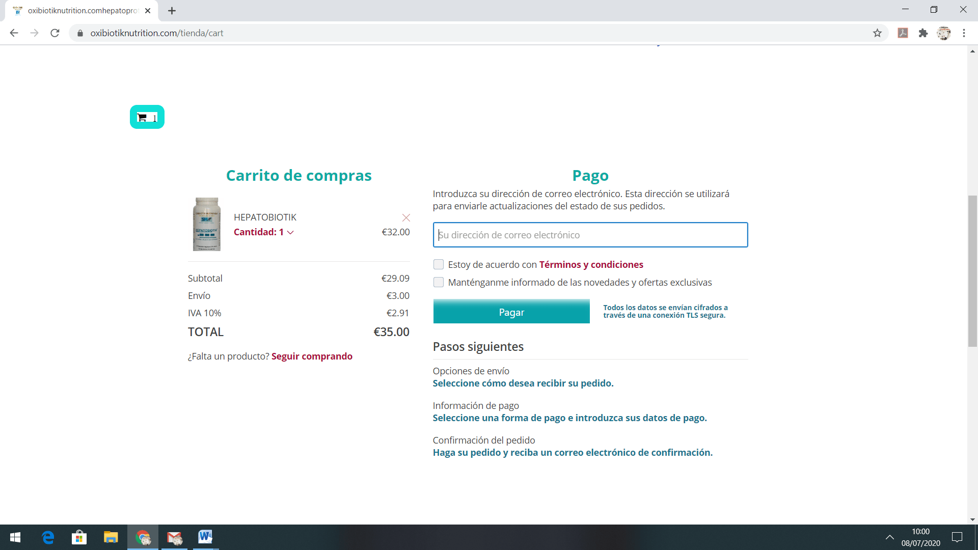 7- una vez realizadas las compras, indique su e-mail y marque las casillas que se indican.